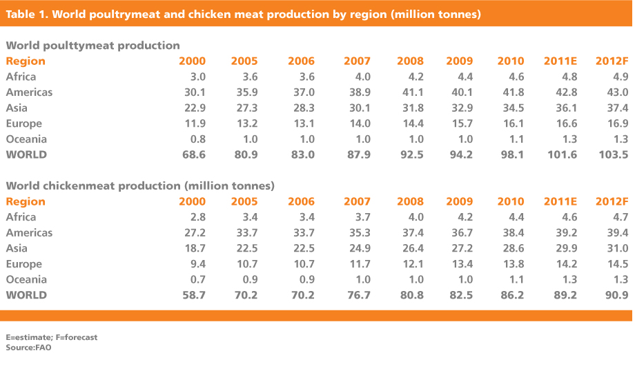 World chicken meat production (table birds plus culled layers) will likely exceed 93 million tonnes in 2013 while, according to United States Department of Agriculture (USDA) estimates, broiler meat output will amount to around 84.6 million tonnes (Table 1).
