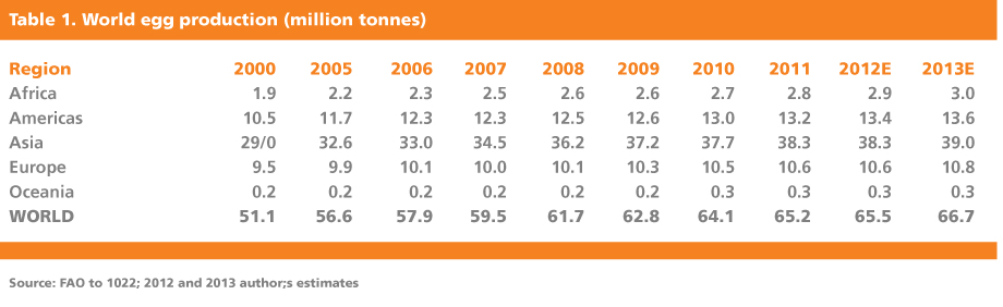 While it looks as though 2012 saw little or no growth, Asia's egg industries now appear to have embarked on the expansion road again with production estimated to have reached at least 39 million tonnes last year which would equate with around 58.5 per cent of a global forecast of a little below 67 million tonnes (Table 2).